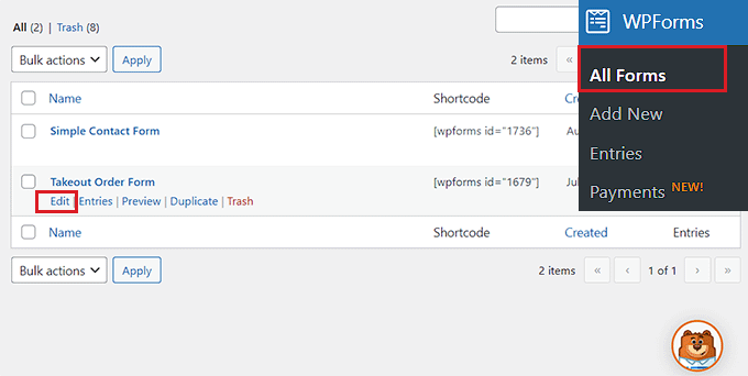 To do this, visit the WPForms » All Forms page from the WordPress dashboard and click the ‘Edit’ link under the form where you want to add a coupon field.