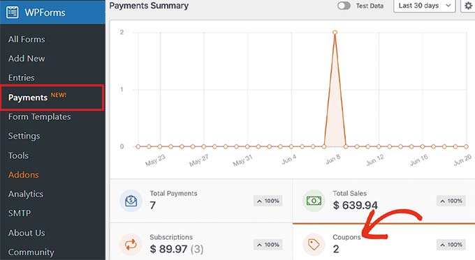 To view your coupon usage, just visit the WPForms » Payments page from the WordPress admin sidebar.